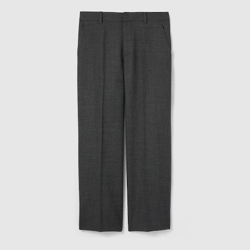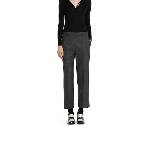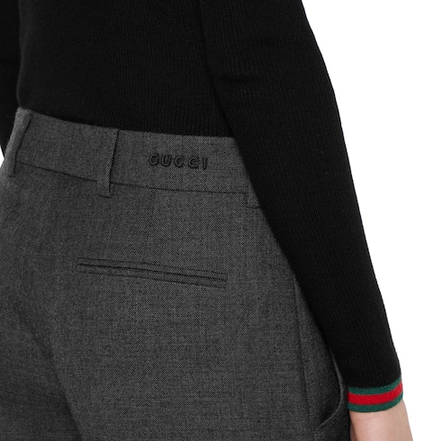 La collezione Pre-Fall 2025 presenta una nuova interpretazione dei materiali caldi su capispalla e modelli outerwear sofisticati, proposti con silhouette classiche e contemporanee. Questi pantaloni sono realizzati in grisaglia di lana e sfoggiano un ricamo Gucci.