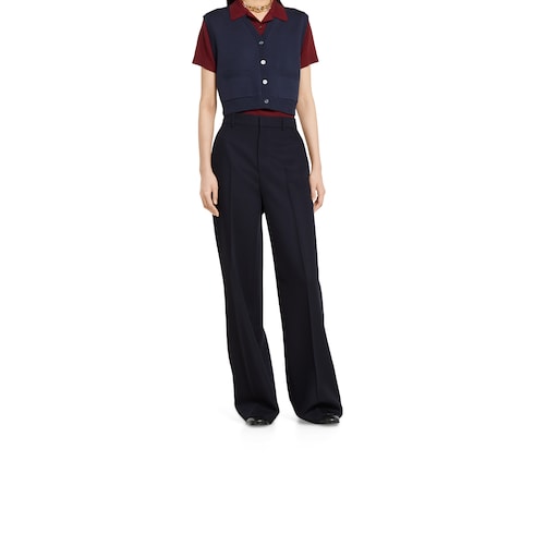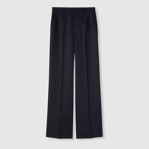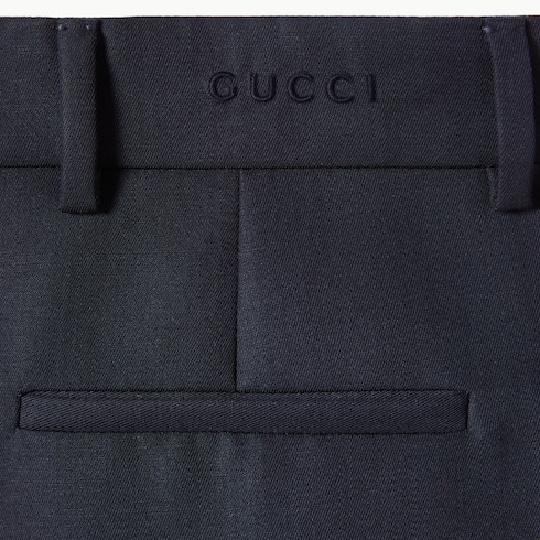 La collezione Pre-Fall 2025 presenta una nuova interpretazione dei materiali caldi su capispalla e modelli outerwear sofisticati, proposti con silhouette classiche e contemporanee. Questo pantalone classico in lana sfoggia un discreto logo Gucci in rilievo.