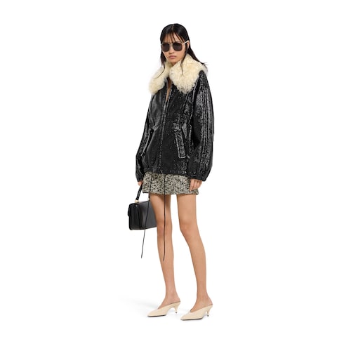 La collezione di capi ready-to-wear donna Cruise 2026 mette in risalto materiali pregiati su silhouette essenziali per annunciare l'arrivo della stagione fredda. Questa gonna è realizzata in tessuto bouclé laminato, qui proposto nell'abbinamento cromatico nero e bianco.