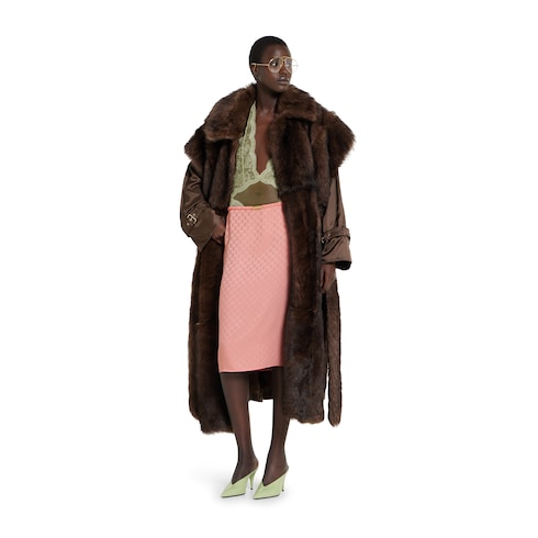 Parte della collezione Autunno Inverno 2025, questa gonna presenta una vita elasticata con ruche e dettaglio Gucci in metallo sul davanti. Il modello, senza fodera, è completato da uno spacco sul retro e una chiusura con cerniera.