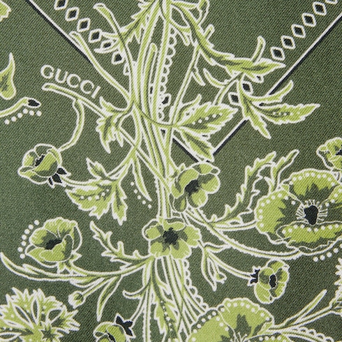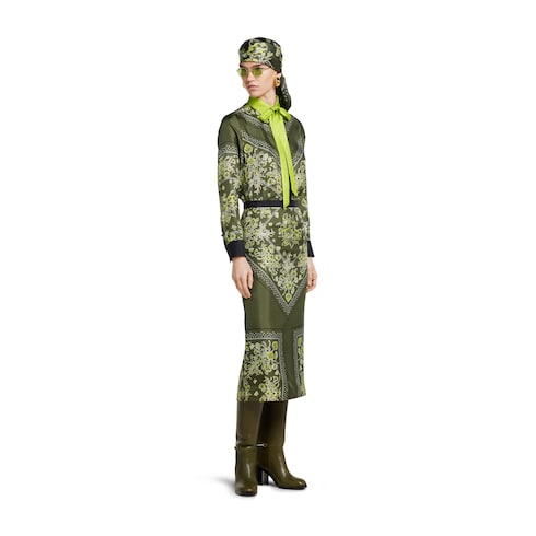 Il verde caratterizza la palette cromatica della collezione Pre-Fall 2025 giocando con texture, dettagli con logo e diverse nuance di colore, come nei look visti in passerella. Questa gonna in twill di seta è ravvivata da una stampa bandana floreale all over.