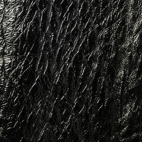 Nella collezione Autunno Inverno 2025, materiali innovativi propongono nuove interpretazioni dei capi indispensabili del guardaroba. Questa gonna, realizzata in pelle lucida accoppiata con neoprene, presenta uno spacco laterale e una chiusura con cerniera invisibile sul fianco.