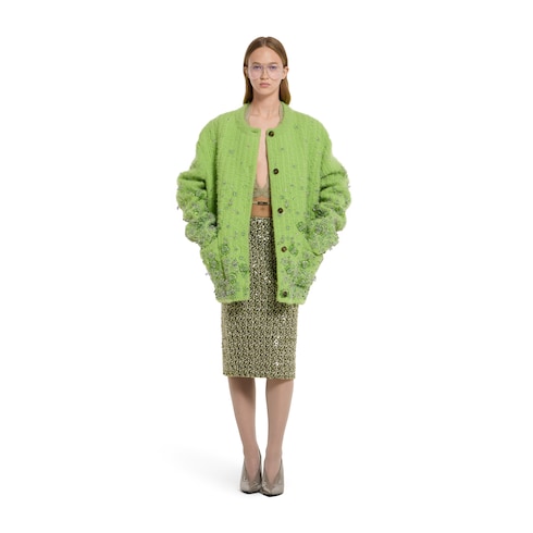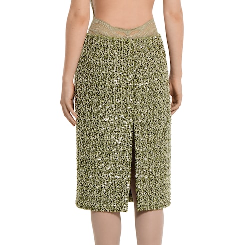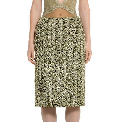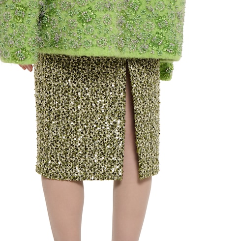 Parte della collezione Autunno Inverno 2025, questa gonna ricamata è definita da una silhouette strutturata e vanta un'eleganza sobria e discreta. Completamente foderata, presenta uno spacco sul retro e una chiusura con cerniera posteriore.