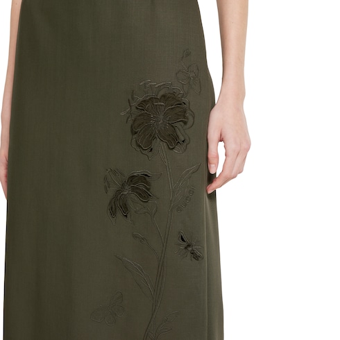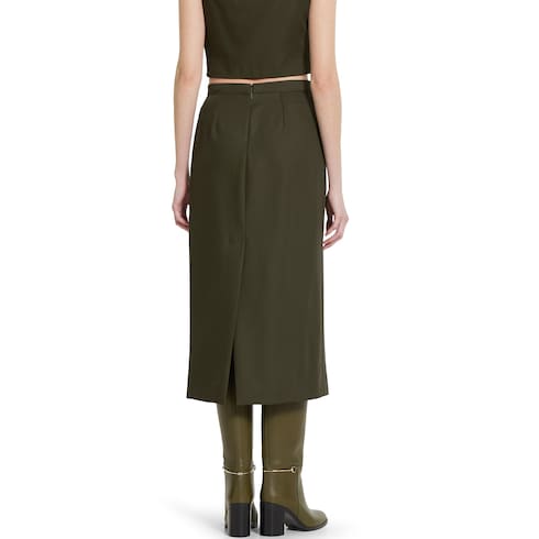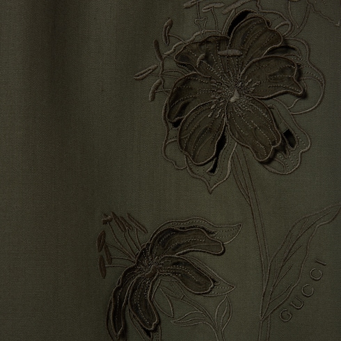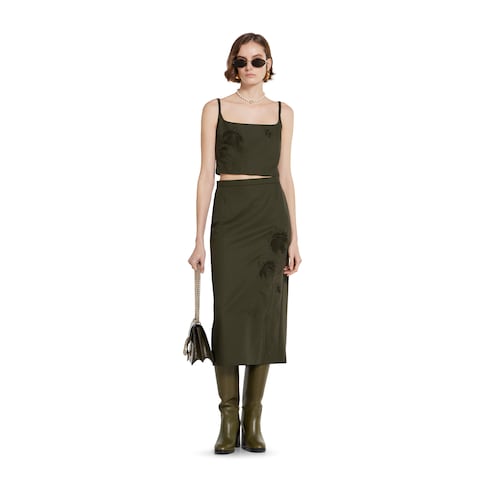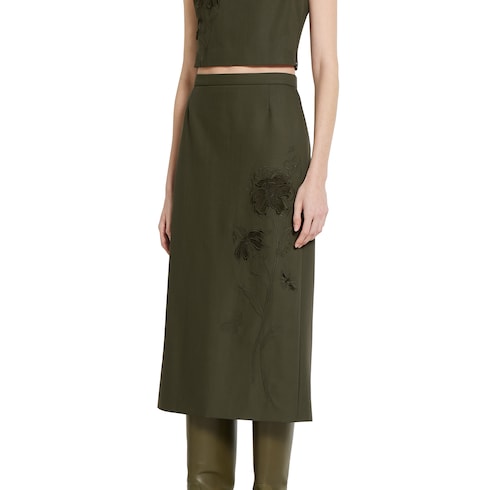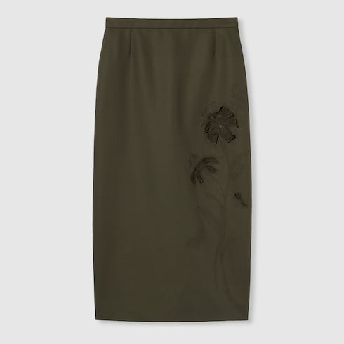 La collezione Pre-Fall 2025 presenta una nuova interpretazione dei materiali caldi su capispalla e modelli outerwear sofisticati, proposti con silhouette classiche e contemporanee. Questa gonna con spacco sul retro è realizzata in lana mohair e impreziosita da un delicato ricamo floreale Gucci. Può essere abbinata al top coordinato per un look completo.