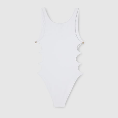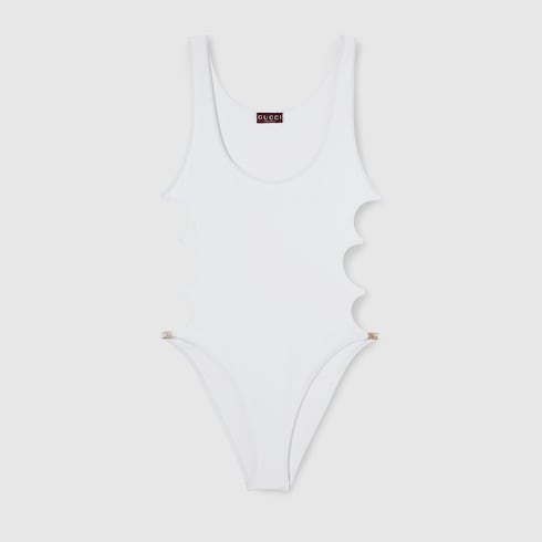 I codici emblematici della Maison e gli eleganti motivi vengono reinterpretati in chiave contemporanea per la collezione Pre-Fall 2025. Questo costume da bagno in jersey stretch sparkling è impreziosito da dettagli cut-out contemporanei sui lati e da una Doppia G sul retro.