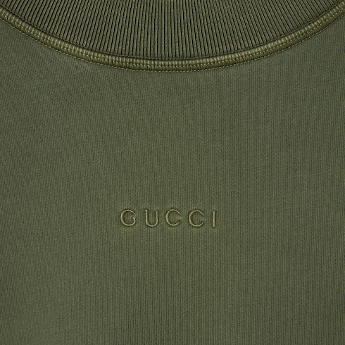 Il verde caratterizza la palette cromatica della collezione Pre-Fall 2025 giocando con texture, dettagli con logo e diverse nuance di colore, come nei look visti in passerella. Questa felpa è realizzata in jersey di cotone declinato nell'esclusiva tonalità ed è arricchita da un ricamo Gucci.