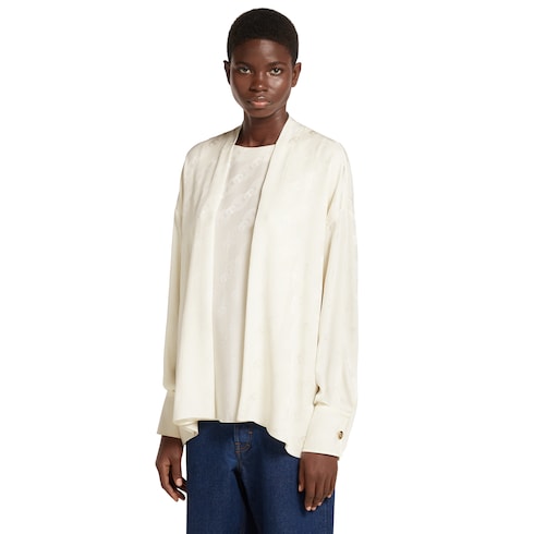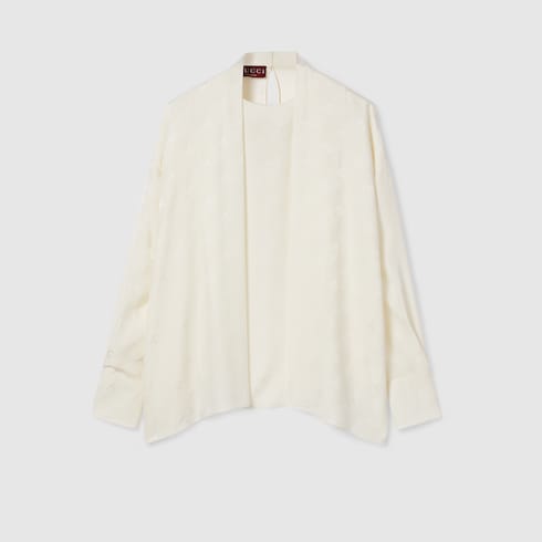 Righe alla marinara, il design Gucci Marina Chain e motivi distintivi arricchiscono le silhouette casual della collezione Pre-Fall 2025, perfette da indossare in riva al mare. Questa maglia con elegante fiocco da annodare al collo è realizzata in seta jacquard Marina Chain.