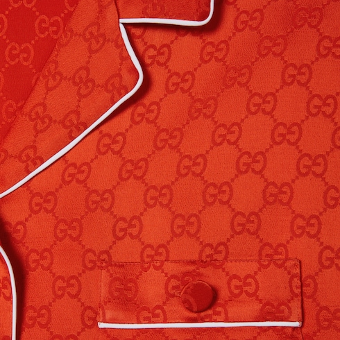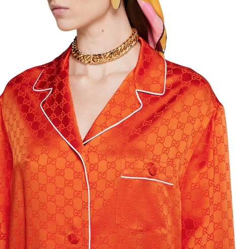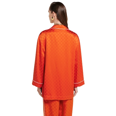 Per la collezione Pre-Fall 2025, top e abiti colorati aggiungono un tocco vivace alla linea ready-to-wear del guardaroba di mezza stagione. Questa camicia, proposta in colore arancione brillante, è realizzata in un delicato raso GG e completata da finiture con profilo a contrasto.