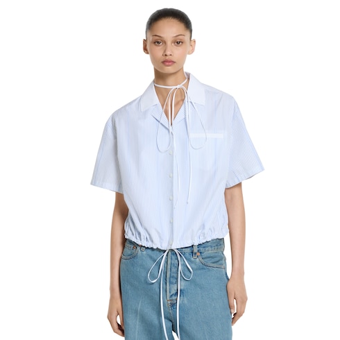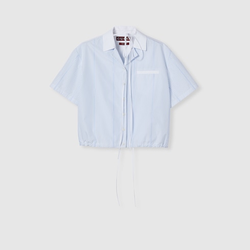 Righe alla marinara e motivi distintivi arricchiscono le silhouette casual della collezione Pre-Fall 2025, perfette da indossare in riva al mare. Il logo Gucci è proposto come dettaglio discreto su questa camicia a maniche corte con nastro annodabile realizzata in cotone fil coupé a righe.