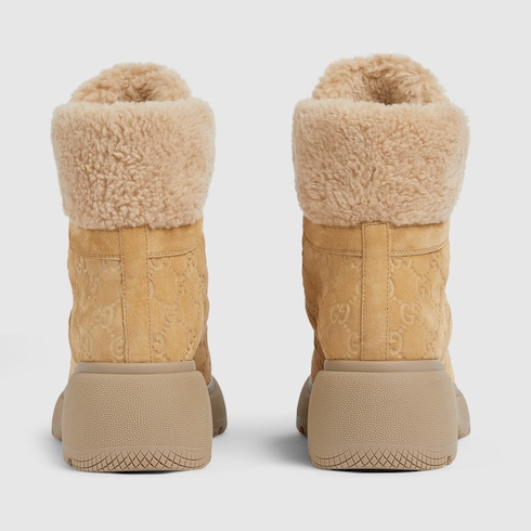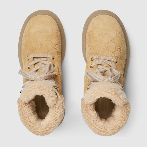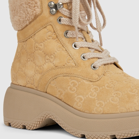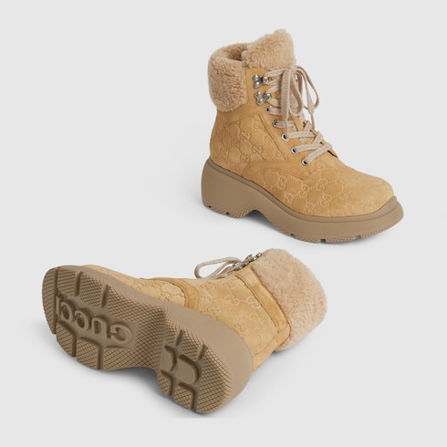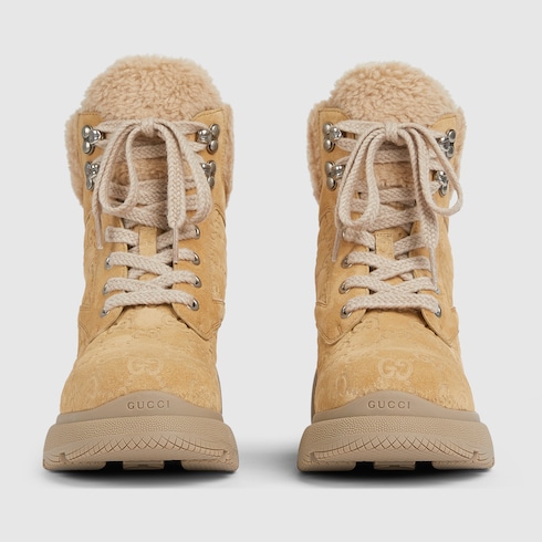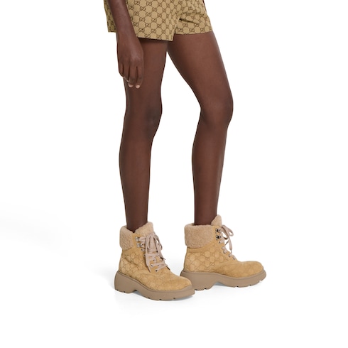 Ispirato ai modelli da escursionismo, questo stivale stringato da donna combina funzionalità e stile distintivo. Realizzato in pelle scamosciata GG e foderato in soffice lana merinos, il design è una reinterpretazione unica ed esclusiva dell'abbigliamento outdoor.