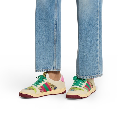 Influenzate dalle classiche sneaker degli anni '70, le nostre Screener prendono il nome dalla mossa difensiva del mondo dello sport. Qui, l'emblematico modello è realizzato in tessuto multicolore con un ricamo GG colorato e una fascia rosa e verde che richiama il nastro Web.
