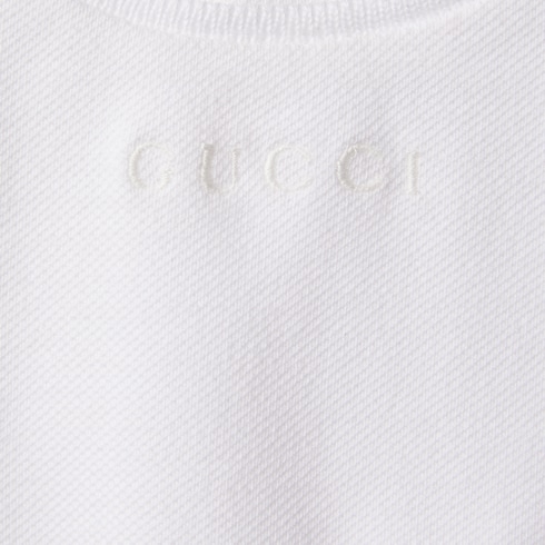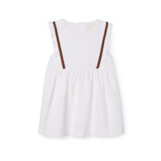 Архивная полоса Web представлена в детской коллекции Cruise 2025 в различных вариациях. Красно-зеленая отделка на предметах одежды, обуви и аксессуарах создает спортивное настроение для любого приключения. Это платье для детей 0–1 года выполнено из эластичного хлопка пике и украшено вышитым логотипом Gucci и отделкой с полосой Web и оборками.