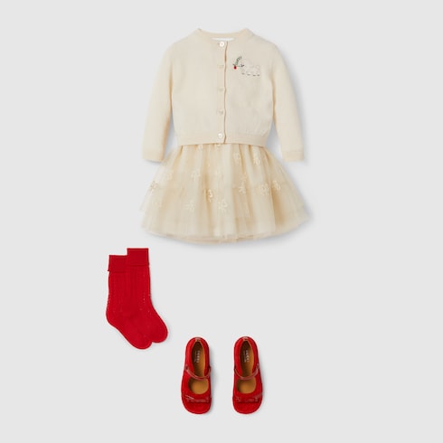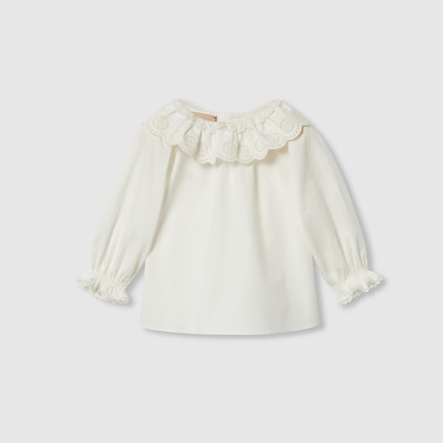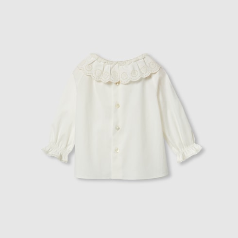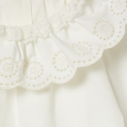 От принтов до деталей с вышивкой, название и логотип Дома украсили в различных формах предметы одежды и аксессуары из коллекции Pre-Fall 2024. Эта рубашка свободного кроя для детей 0–1 года выполнена из эластичного хлопка пике белого цвета и дополнена воротником с вышитым логотипом Double G.