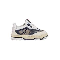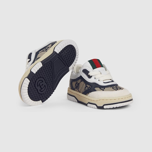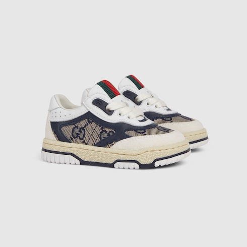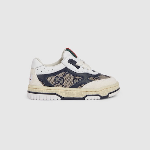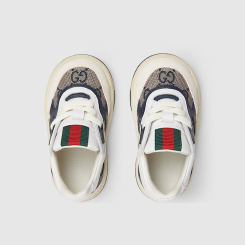 The archival Web stripe appears throughout the latest children's collection in a variety of iterations. Green and red trims across ready-to-wear, shoes and accessories create a sporty attitude, fit for every adventure. These toddler Gucci Re-Web sneakers have been crafted from a white leather and beige and blue GG canvas with tonal suede details.