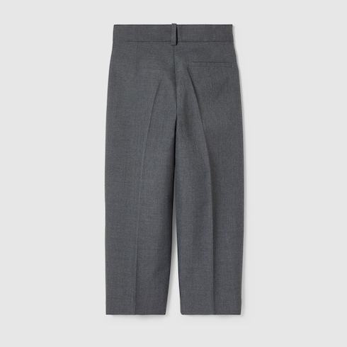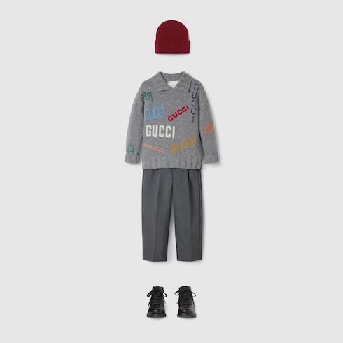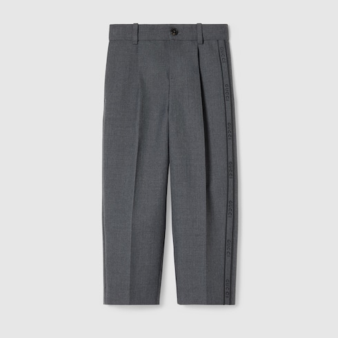Фирменные символы по-прежнему украшают детскую коллекцию Gucci Cruise 2025 в виде изящных вышивок и сплошных принтов. Эти брюки для детей 3–12 лет выполнены из шерстяной саржи и украшены вышитым логотипом Gucci.