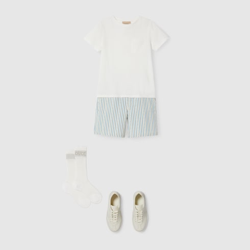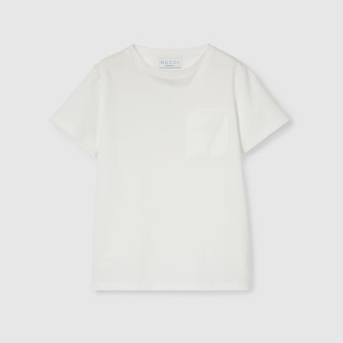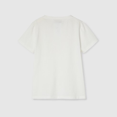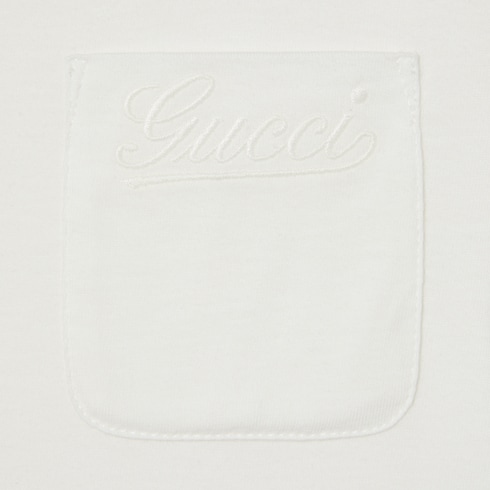Фирменные символы по-прежнему украшают детскую коллекцию Gucci Cruise 2025 в виде изящных вышивок и сплошных принтов. Эта футболка для детей 3–12 лет выполнена из хлопкового джерси и украшена вышивкой кристаллами в виде надписи «Gucci».