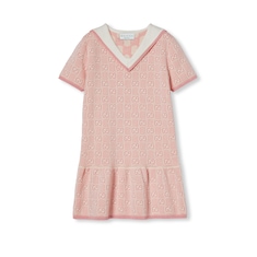 Фирменные символы по-прежнему украшают детскую коллекцию Gucci Cruise 2025 в виде изящных вышивок и сплошных принтов. Это платье для детей 3–12 лет выполнено из хлопка с жаккардовым орнаментом GG и дополнено матросским воротником и расклешенной юбкой.