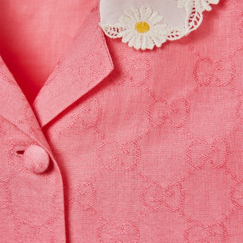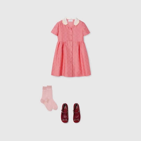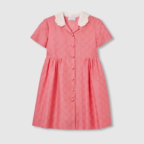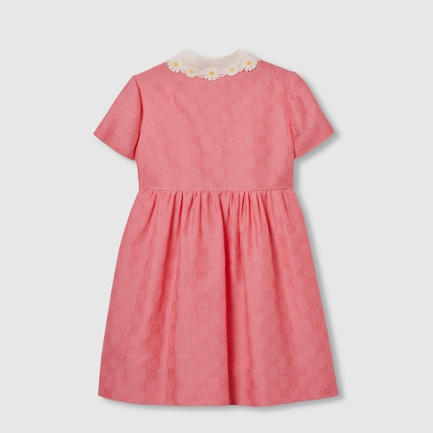 Фирменные символы по-прежнему украшают детскую коллекцию Gucci Cruise 2025 в виде изящных вышивок и сплошных принтов. Это платье для детей 3–12 лет было изготовлено из хлопка с жаккардовым орнаментом GG и украшено воротником с вышитыми ромашками.