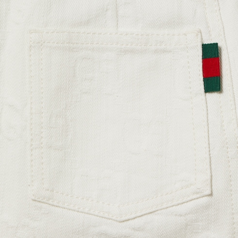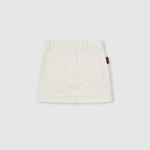Фирменные символы по-прежнему украшают детскую коллекцию Gucci Cruise 2025 в виде изящных вышивок и сплошных принтов. Эта юбка для детей 3–12 лет выполнена из денима с жаккардовым орнаментом GG и дополнена петлей с красно-зеленой полосой Web.