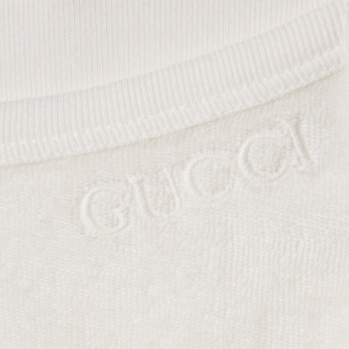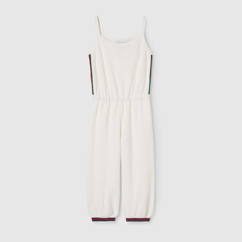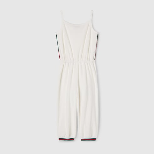 Архивная полоса Web представлена в детской коллекции Cruise 2025 в различных вариациях. Красно-зеленая отделка на предметах одежды, обуви и аксессуарах создает спортивное настроение для любого приключения. Этот комбинезон для детей 3–12 лет выполнен из махровой ткани и украшен красно-зеленой отделкой Web и вышитым логотипом Gucci.