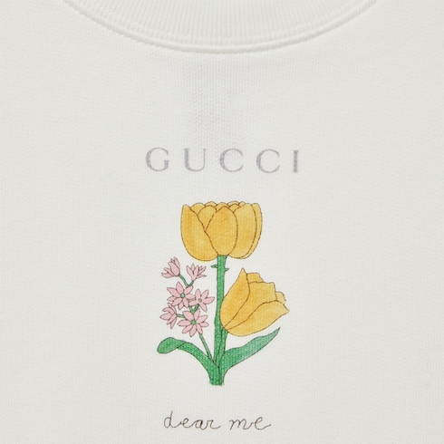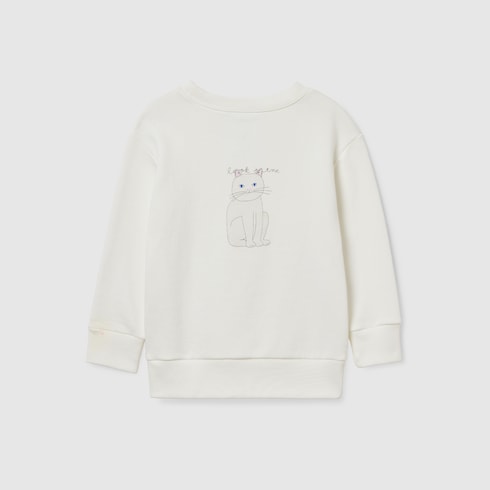 Автор и художница из Южной Кореи На Он Чон создает озорные и ностальгические изображения, вдохновленные ее повседневной жизнью и корейской культурой. В детской коллекции Cruise 2025 принты с ее изображениями кошек и другими забавными мотивами сочетаются с названием Дома. Этот свитшот оверсайз для детей 3–12 лет украшен принтом в виде цветов Gucci и кошки.