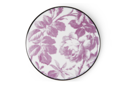 Colorful interpretations of the Flora print standout against a white backdrop across a selection of porcelain pieces for Pre-Fall 2025. Here it appears across a trinket box with a contrasting black trim.
