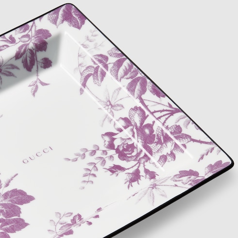 The House's Decor collection continues to reinterpret emblematic motifs, from the GG, Web, bamboo, Horsebit and equestrian inspirations, in sumptuous materials, intricate craftsmanship, and fresh hues. This large trinket tray is stated in Ginori 1735 porcelain and features a delicate Herbarium print.