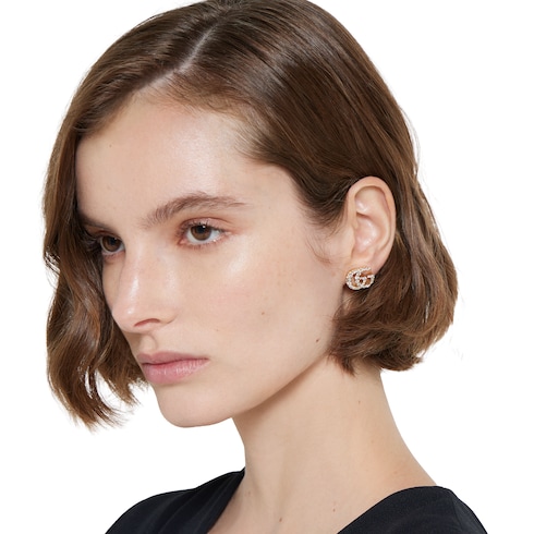 A signature emblem of the House, the initials of Founder Guccio Gucci define many fashion jewelry pieces. The gold-toned Double G is set with crystals, adding a sparkling logo touch to the stud earring design.