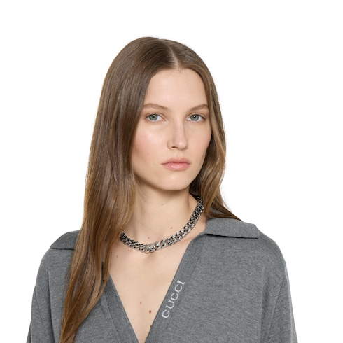 Bold logo detailing drives the Gucci Signature line for Pre-Fall 2025 with silver-toned chain necklaces and earrings featuring an allover GG motif. This necklace features the logo detail engraved across the gourmette chain.