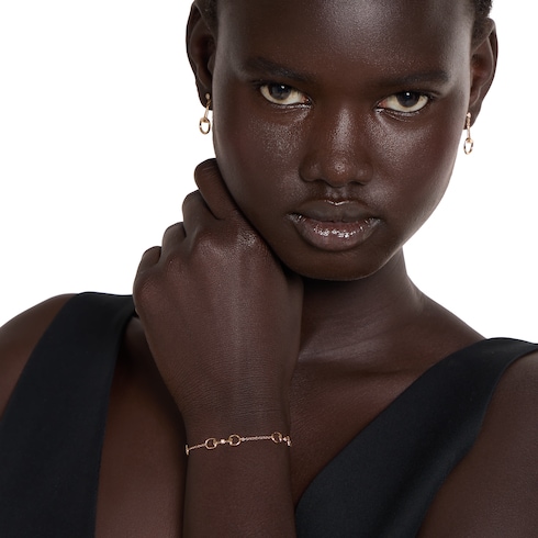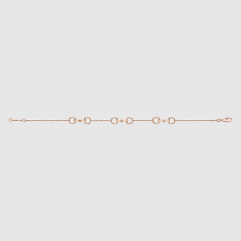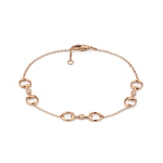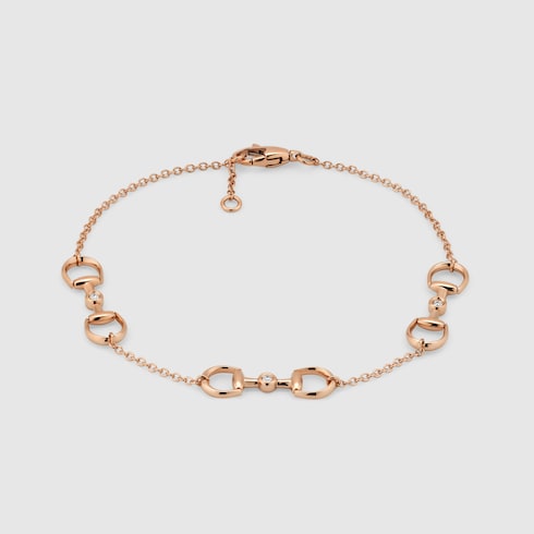 An extension of the Horsebit range includes eye-catching diamonds across a selection of rose gold jewelry pieces. This bracelet displays the equestrian-inspired motif as three charm details.