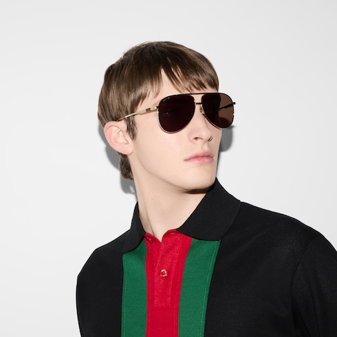 Коллекция очков Pre-Fall 2024 успешно сочетает в себе классические модели прошлых десятилетий с современной символикой бренда. Золотистая металлическая оправа сочетается с полосой Web и логотипом Gucci.