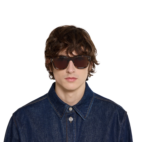 The Pre-Fall 2025 eyewear collection successfully combines the coveted silhouettes of bygone decades with a contemporary logo feel. Here, this brown and dark green spotted tortoiseshell acetate frame pairs with a Gucci logo.