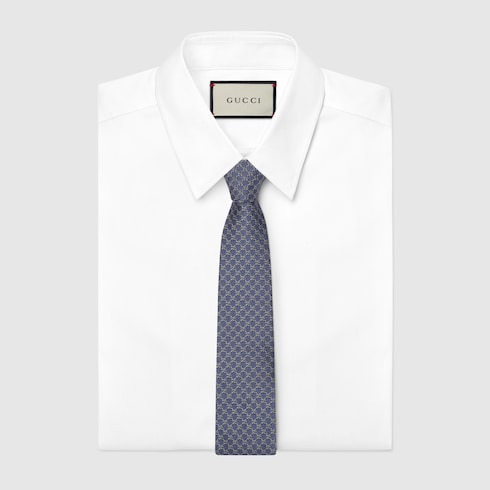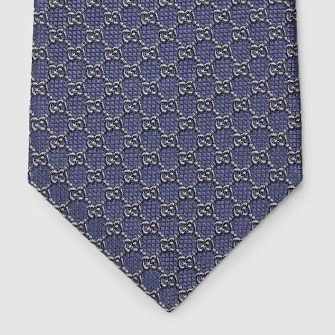Подборка шелковых аксессуаров украшена узором в виде инициалов основателя Дома Гуччио Гуччи. Этот галстук выполнен из шелка с жаккардовым орнаментом GG темно-синего и синего цветов.