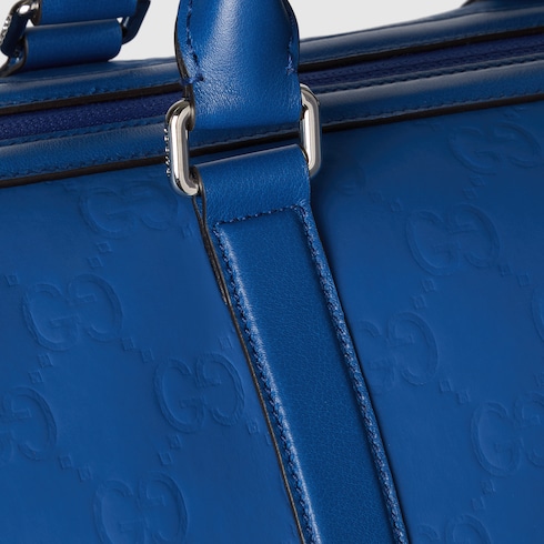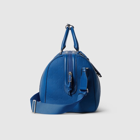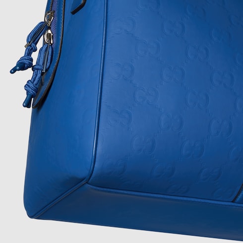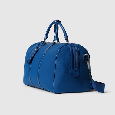 The name Gucci Edge captures the energy of streamlined silhouettes as innovative material meets lightweight adaptability, marked by the subtle GG monogram. This medium duffle bag is stated in a GG matte rubber fabric and comes complete with a leather detachable Liftboy ID tag.