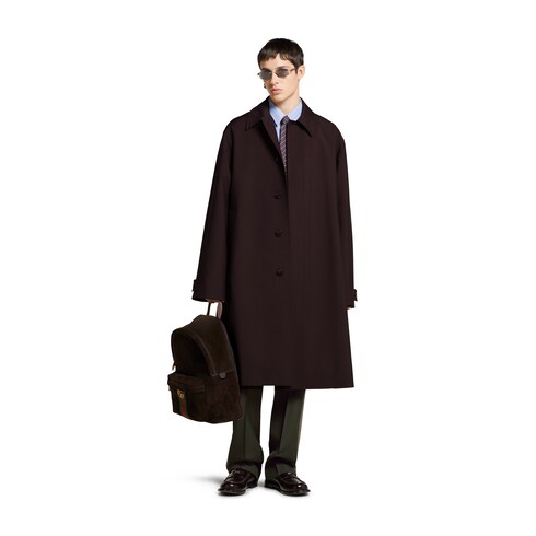 Fall shades define a selection of sartorial pieces paired with heritage details of the House. Timeless elegance meets contemporary flair with a focus on sharp tailoring and relaxed fit. Crafted from dark burgundy boded wool, this coat is enriched with an embossed Gucci logo beneath the collar and finished with a GG lining.