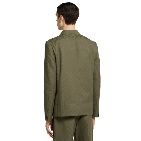 Pre-Fall 2025 pieces in muted black, grey and green tones spotlight delicate floral embroideries, embossed logos, and more craftsmanship details. Crafted from forest green cotton blend canvas, this single-breasted jacket is defined by the GG monogram.