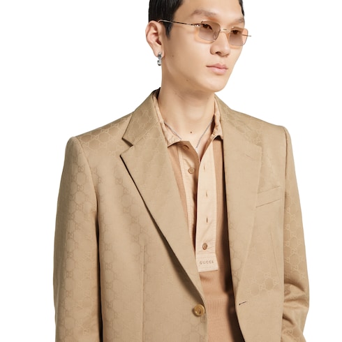 For the Pre-Fall 2025 collection, a leisure-inspired approach to formalwear introduces new silhouettes and cuts. Signature elements are combined with refined details. This jacket appears in light beige GG cotton gabardine jacquard.