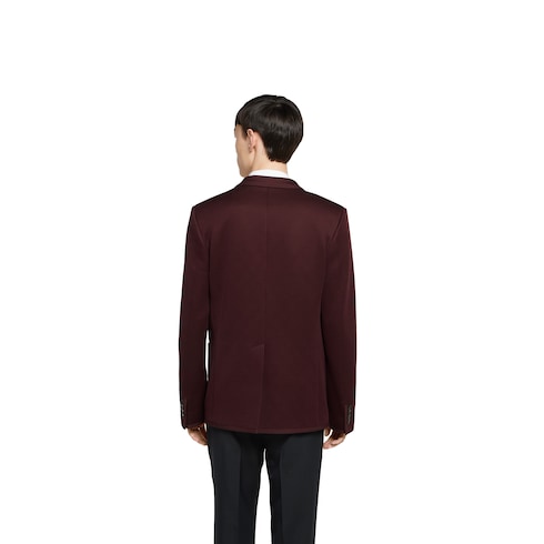 Fall shades define a selection of sartorial pieces paired with heritage details of the House. Timeless elegance meets contemporary flair with a focus on sharp tailoring and relaxed fit. Crafted from burgundy textured jersey GG, this single-breasted jacket is finished with a gros grain trim.
