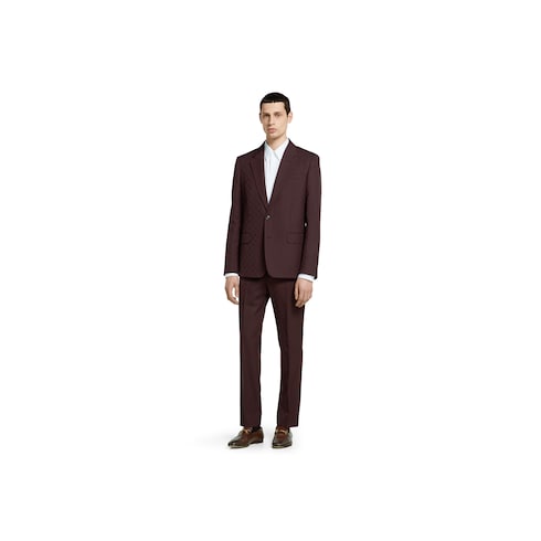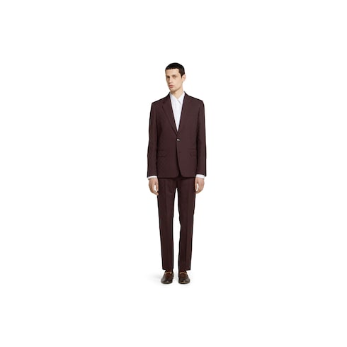 For the Pre-Fall 2025 collection, a leisure-inspired approach to formalwear introduces new silhouettes and cuts. Signature elements are combined with refined details. This suit appears in dark burgundy GG wool jacquard.