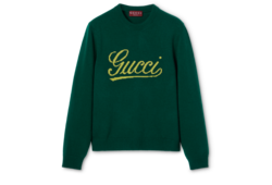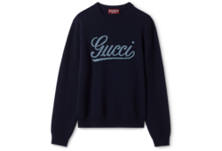 Versatile pieces made of cotton-based fabrics are embellished with an archival-inspired logo which adds a touch of flair to complete the wardrobe. This sweater appears in dark blue knit wool and features a Gucci script intarsia.