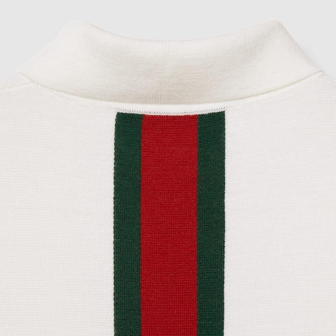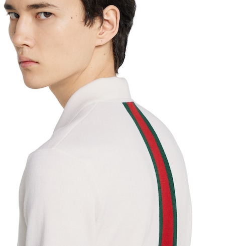 The House continues to explore its connection to the world of tennis that began in the 1970s. Signature pieces focus on heritage details like the Web stripe, as well as innovative materials. This ivory knit wool polo T-shirt is defined by a Web detail on the back.
