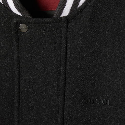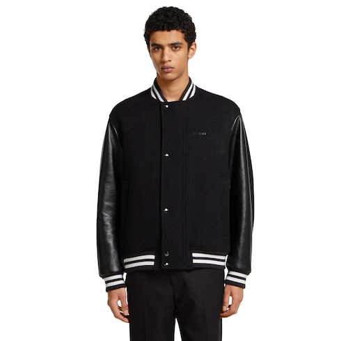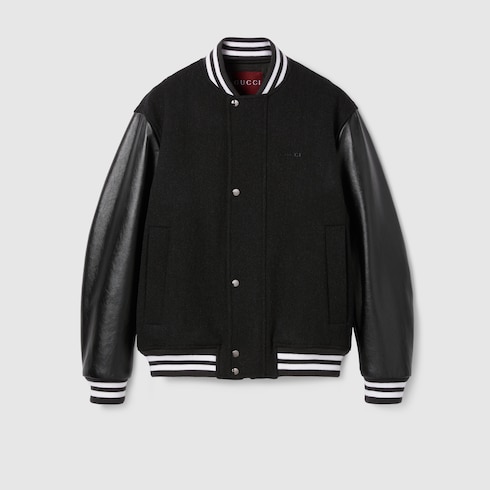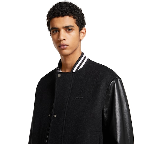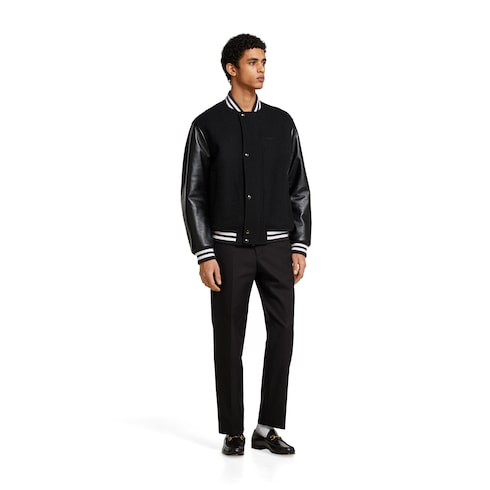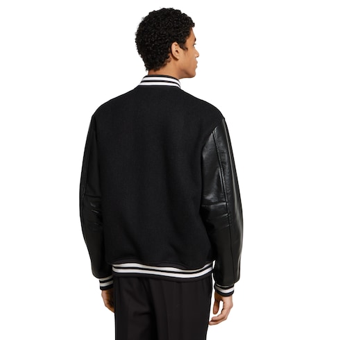 Urban essential outwear such as bombers and leather jackets blend sophistication and sumptuous materials with a refined touch for the Pre-Fall 2025 collection. Crafted from black batavia wool, this bomber jacket features leather sleeves and a knit ribbed trim.