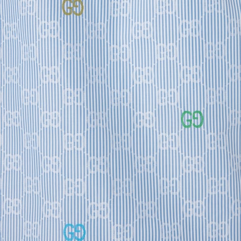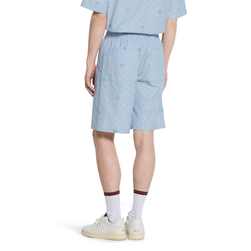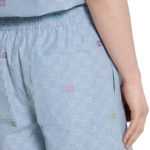 Gucci's House codes continue to evolve for the new season. Crafted from white and grey striped cotton, this pair of shorts is enriched with an allover multicolor GG fil coupé.