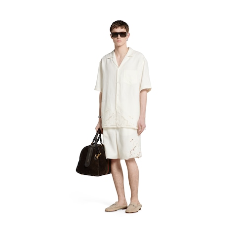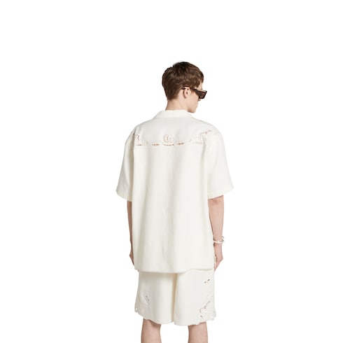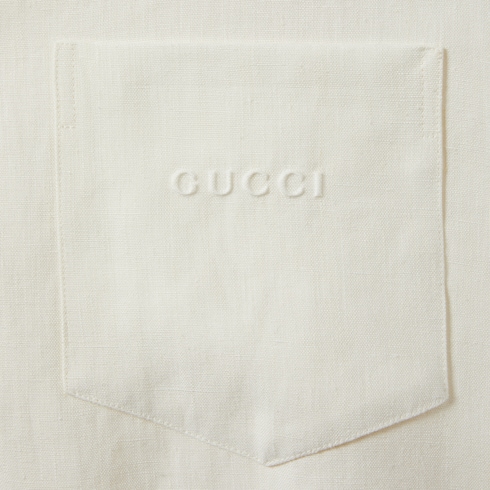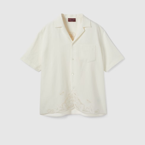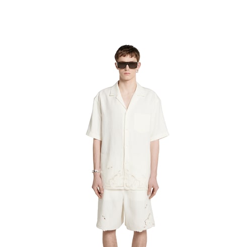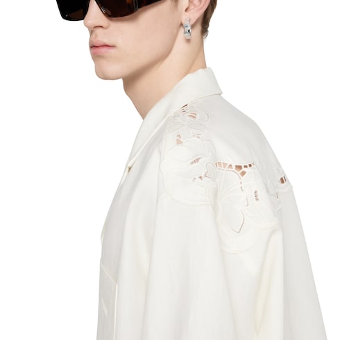 The Pre-Fall 2025 collection elevates the everyday wardrobe with a mix of textures, motifs and colors. Crafted from white linen, this bowling shirt features an intricate floral embroidery, adding a refined touch of artisanal chic to summer pieces.