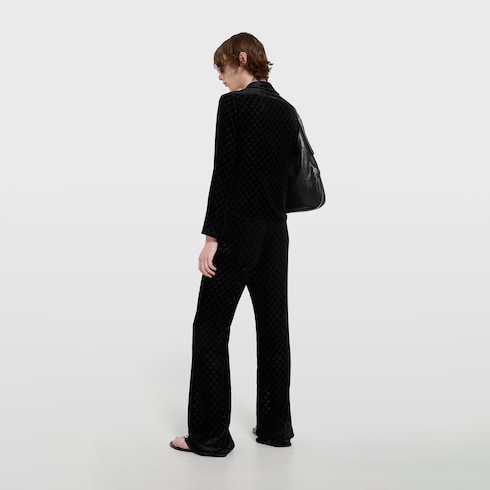 Introducing Spring Summer 2026. This style is featured as part of the "Principino" look of La Famiglia, which reinterprets the House’s codes through singular personalities and distinctive aesthetic attitudes. Crafted from stretch GG velvet devoré, this shirt is finished with Double G buttons.