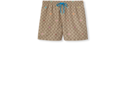 In the Pre-Fall 2025 collection, Chinese artist Currynew (Xiang Zhang) puts a twist on the House logo across men’s ready-to-wear, leathergoods, and accessories. Crafted from beige and dark brown technical poplin, these swim shorts feature an allover GG and Gucci print.