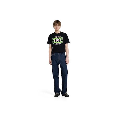 Everyday pieces are elevated with the Gucci selvedge or Gucci vintage logo print for an urban feel. Crafted from black cotton jersey, this T-shirt is defined by a Gucci Interlocking G striped print.