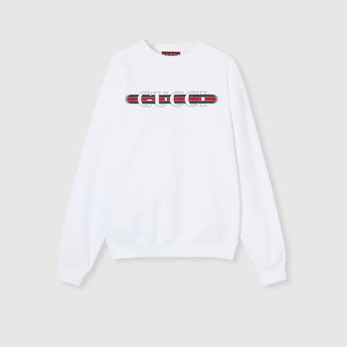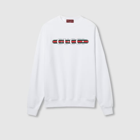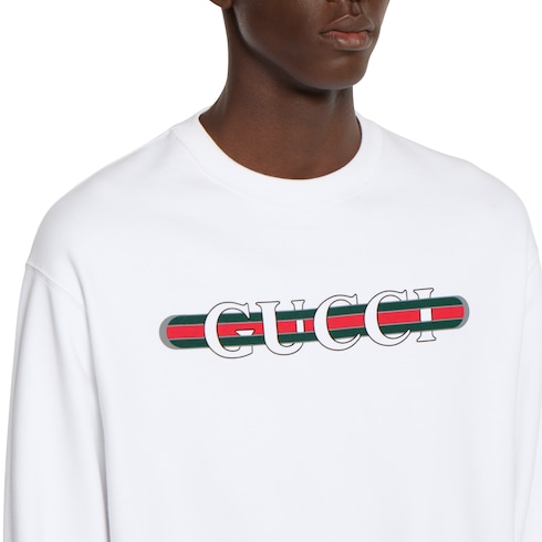 Gucci's House codes continue to evolve for the new season across jersey pieces. This regular fit sweatshirt has been crafted from white cotton jersey and enriched with a Gucci Web print.