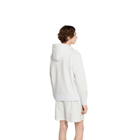 Maritime-inspired designs enrich casual silhouettes perfect for the seaside, featuring stripes, anchor motifs and the House logo in the Pre-Fall 2025 collection. This zip jacket appears in white embossed GG technical jersey.