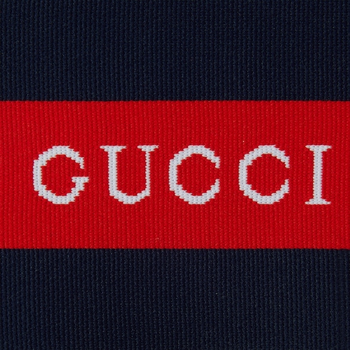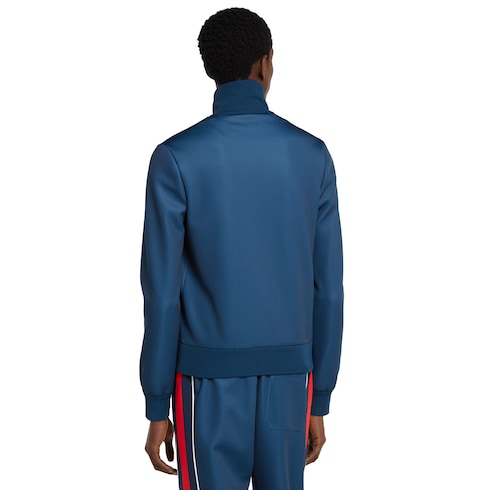 The House continues to explore its connection to the world of tennis that began in the 1970s. Signature pieces focus on heritage details like the Web stripe, as well as innovative materials. This dark blue light neoprene zip jacket is defined by a Web intarsia.